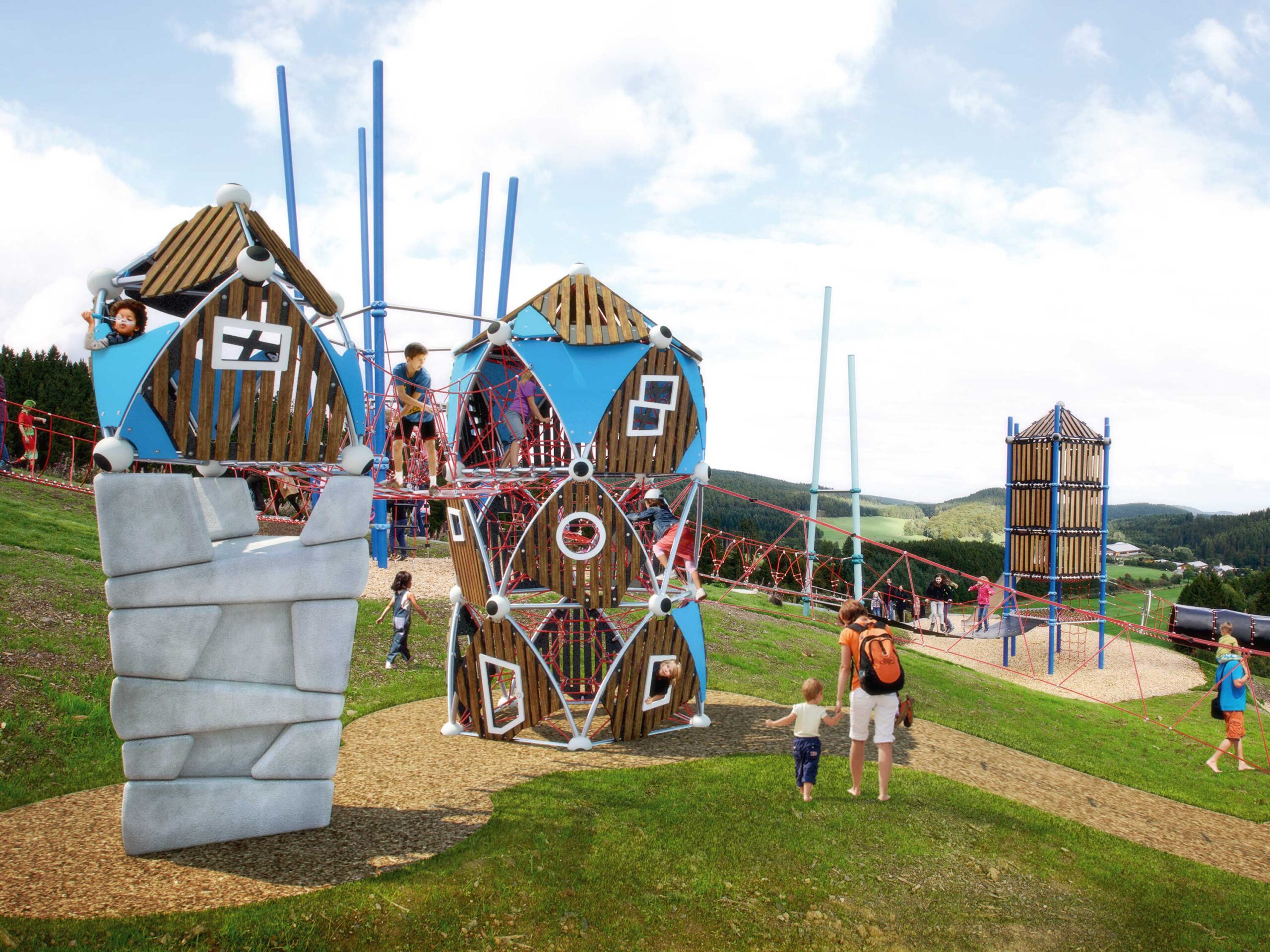 Um die Kinder in Bewegung zu halten und sie immer wieder vor Herausforderungen zu stellen, wurde diese TripleBoo-Spiellandschaft mit einer Vielzahl weiterer Aktivitäten ausgestattet, unter anderem einem Einstiegsnetz, einer Hängematte, einer Rutsche und einer Brücke, die zum Splash führt.