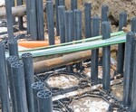 Lage direkt am Fluss. „Das stört uns nicht, wir legen sowieso erst eine Schicht Geotextilvlies aus und arbeiten darauf“, erklärt Vaas. „Bei der nächsten Baumgrube wird es interessant, dort müssen wir die Gasleitungen integrieren. Durch den Klickverbund in der Bodenplatte bekommt man mit dem TreeParker aber wohl auch höhenflexible Systeme hin.“ Sein Team hat mittlerweile auch das zweite System im Boden. „Wo kommt der Baum hin?“ fragt Alexander Magerl. Gute Frage. Nach einem Blick auf den Bauplan entnimmt ein Arbeiter dem Verbund eine Deckplatte und vier Posts – jetzt ist der Standort des Baums fix. Der Lader wartet schon mit der Substratmischung, um die Hohlkammern aufzufüllen.