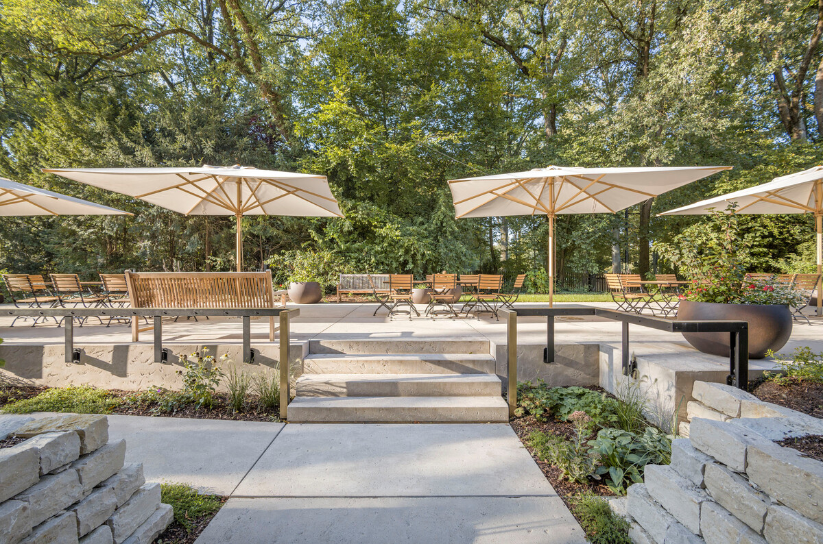 von Godelmann erschienen am 15.10.2025Wenige offene Fugen zwischen den Elementen reichen aus, um den Außenraum selbst bei starkem Niederschlag zuverlässig zu entwässern. Auf diese Weise ist ein klar gestalteter, charmanter Ort für Veranstaltungen im Freien entstanden, der mit der repräsentativen Architektur des Gebäudes harmoniert. Platten und Elemente der Produktfamilie GDM.MASSIMO spielen eine wesentliche Rolle bei der Gestaltung. Jedes Format wurde aus der Hauptfläche heraus entwickelt, ohne optisch störende Schnittkanten. „Wir haben mit offenen Fugen zur Entwässerung in den Unterbau gearbeitet, damit Regenwasser dort rasch abfließen und zur Versickerung geführt werden kann“, so Architekt Georg Zunner. „Die Überformatigkeit der Platten ist wichtig, damit auf der Veranstaltungsfläche möglichst wenige Fugen zur Schlitzentwässerung entstehen. Das macht den neu gestalteten Außenraum der Villa elegant und großzügig.“