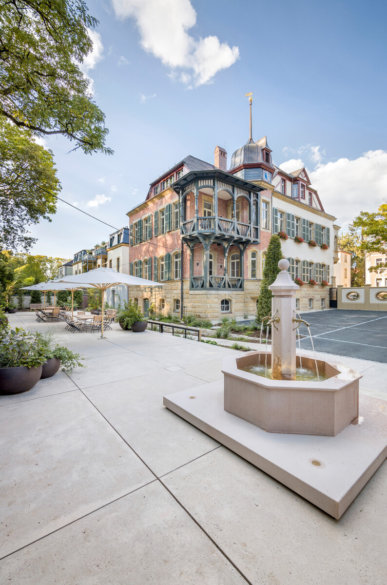Zur Neugestaltung des Außenbereichs für die historische Villa Markgraf in Bayreuth wurden passgenau angefertigte Unikate der Produktfamilie GDM.MASSIMO aus hochfeinem selbstverdichtenden Beton verwendet.