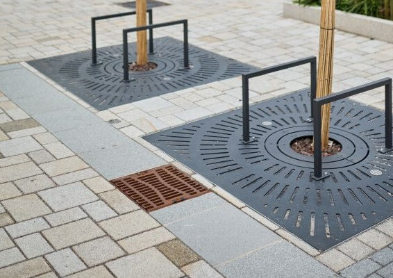 So komplex die Aufgabe war, so pragmatisch wurde sie gelöst – durch eine ebenso robuste wie einfach zu installierende Konstruktion, die zeitgemäßes Regenwassermanagement mit nachhaltigem Baumschutz verbindet. Im Kern beruht der Ansatz darauf, unterhalb der Verkehrsflächen ausreichend Wurzelraum zu schaffen und zugleich Regenwasser für die Versorgung der Bäume nutzbar zu machen. Herzstück ist ein spezieller Schwammstadt-Straßenablauf, den das WaterTech-Unternehmen ACO eigens für den klimaresilienten Umbau urbaner Räume konzipiert hat. Dazu haben die Produktentwickler den praxiserprobten ACO Combipoint-Straßenablauf um Schwammstadt-Bauteile ergänzt. Durch einen integrierten Einlaufschacht werden Niederschläge vor Ort gesammelt und mittels Schmutzfänger und Nassschlammbereich vorgereinigt.