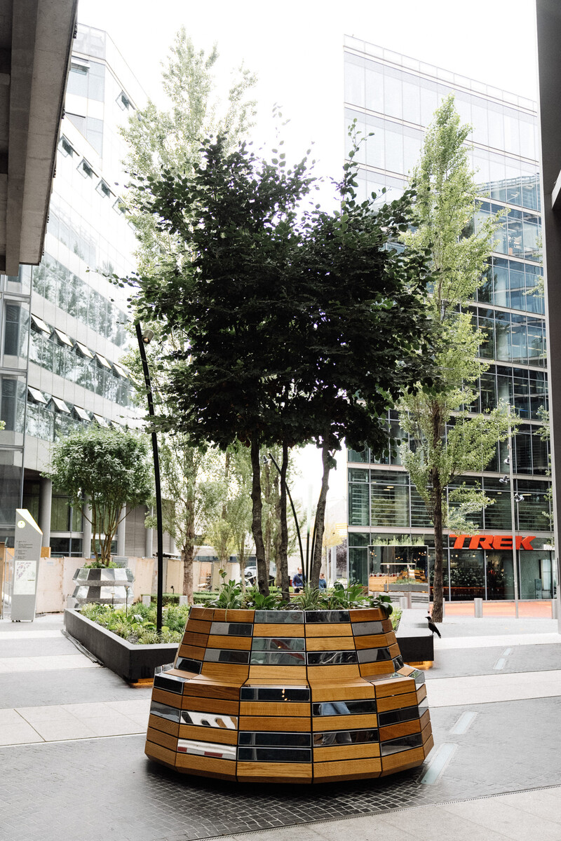 Die Bänke, Sitzgelegenheiten und die meisten Pflanztöpfe sind aus geöltem Eichenholz, einige sind aus industriepoliertem Edelstahl. In den Töpfen sind Retentionsboxen eingebaut. Sie speichern das Wasser und geben es nach und nach über Kapillarmatten wieder an die Pflanzen ab. Eine effiziente und wassersparsame Versorgung der Pflanzen.