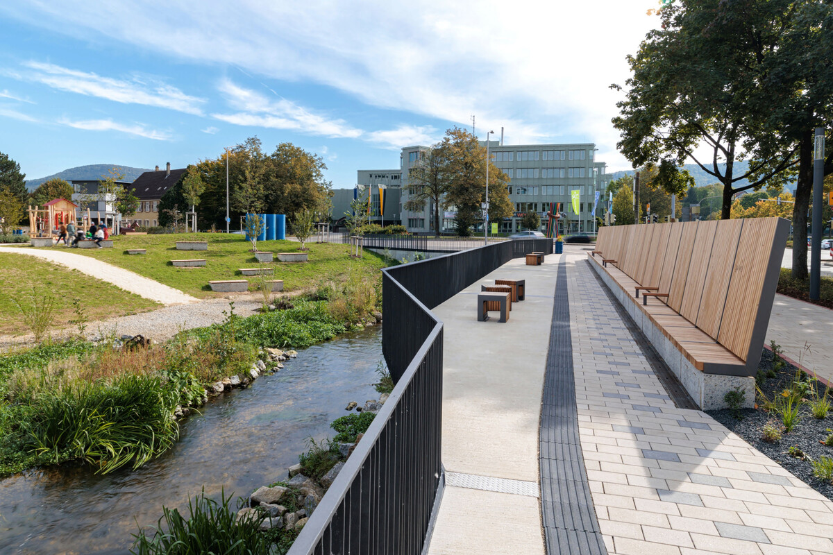 Die Planer wandelten den zentral gelegenen Parkplatz in eine hochwertige Parkanlage mit hoher Aufenthaltsqualität um. Das bislang vollständig versiegelte Rathausumfeld konnten sie dabei umfassend entsiegeln. Darüber hinaus führten sie den Stadtbach an die Oberfläche zurück und renaturierten ihn – ein bedeutender Schritt für die ökologische wie soziale Aufwertung des Areals, so Baldauf. Zu seinem Konzept gehört auch, dass entnommene Materialien nach Möglichkeit wiederverwendet werden. Der Aalener Baubürgermeister Wolfgang Steidle bezeichnet diese Transformation als „Jahrhundertprojekt“.
