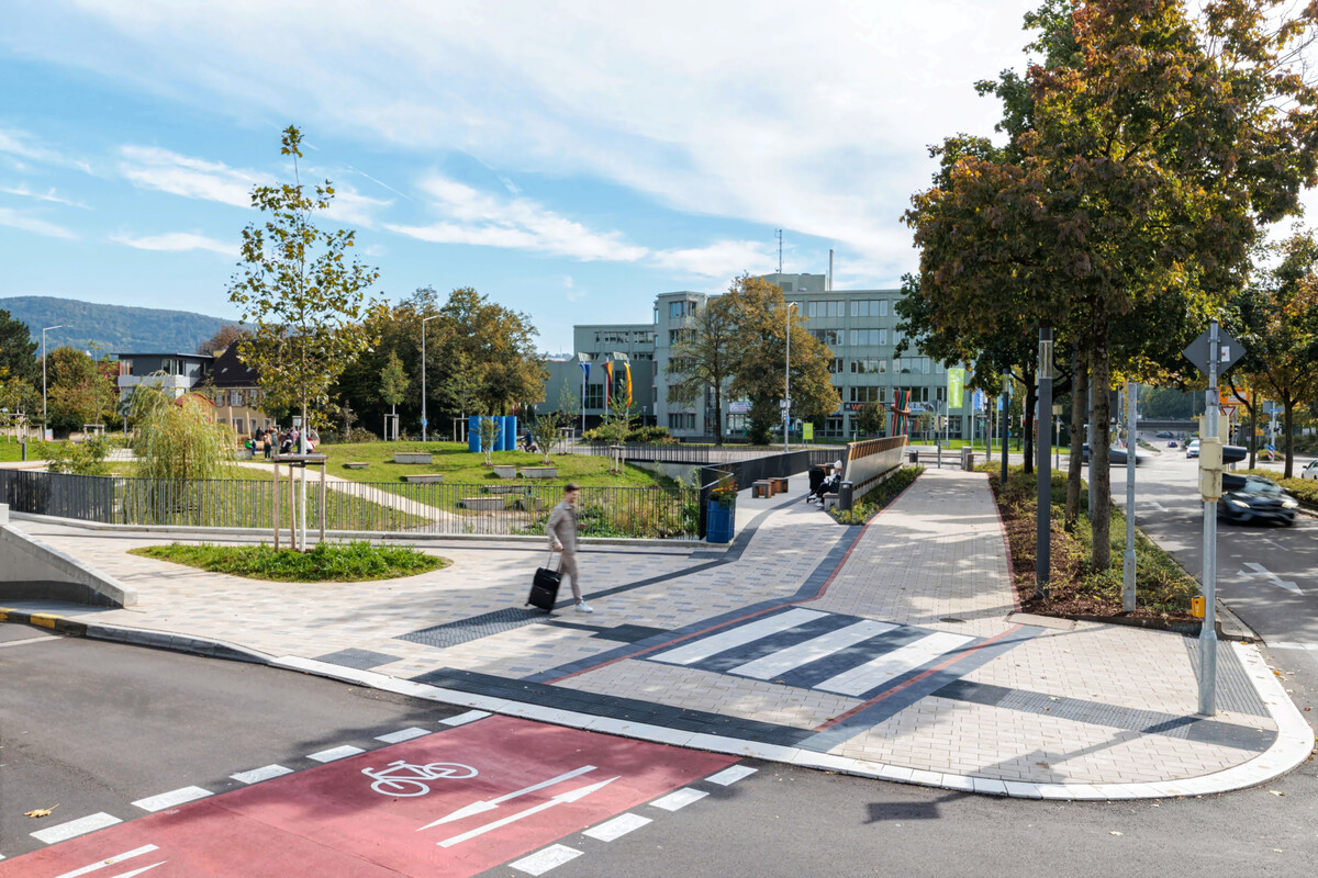 Zusammen mit dem städtischen Auftraggeber wählte bauchplan den GDM.KLIMASTEIN als neuen Bodenbelag. „In unseren Planungen legen wir großen Wert auf durchlässige Bodenflächen“, sagt Tobias Baldauf. Entscheidend sei, was sich unterhalb der neu gestalteten Flächen befinde, nämlich „möglichst weit vernetzte Speichervolumen, die Niederschlagswasser aufnehmen und gezielt an bestehende sowie neu angelegte Grünflächen weitergeben können.“ Dieses System unterstütze eine optimale Verdunstung und leiste damit „einen zentralen Beitrag zur Klimaanpassung im urbanen Raum“.