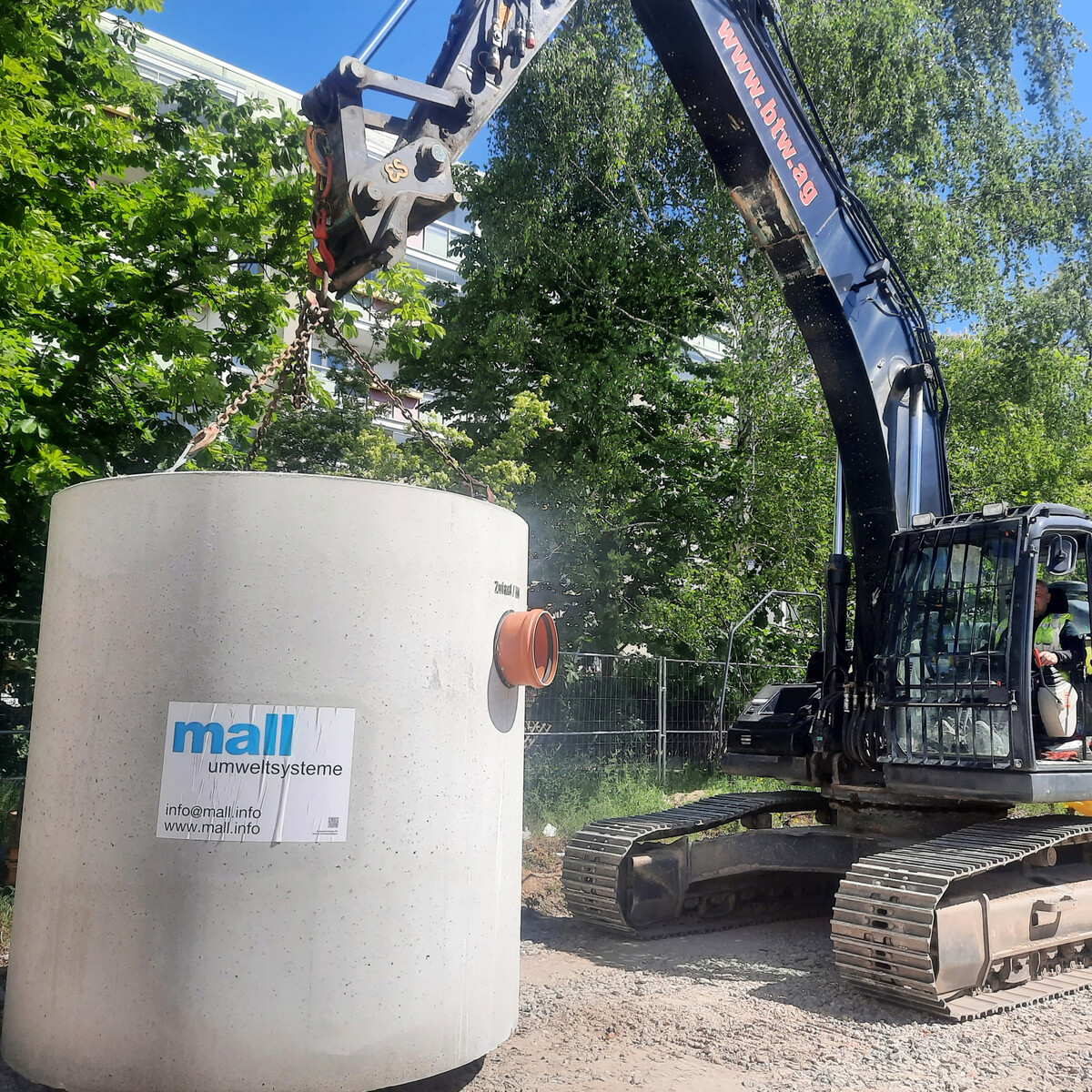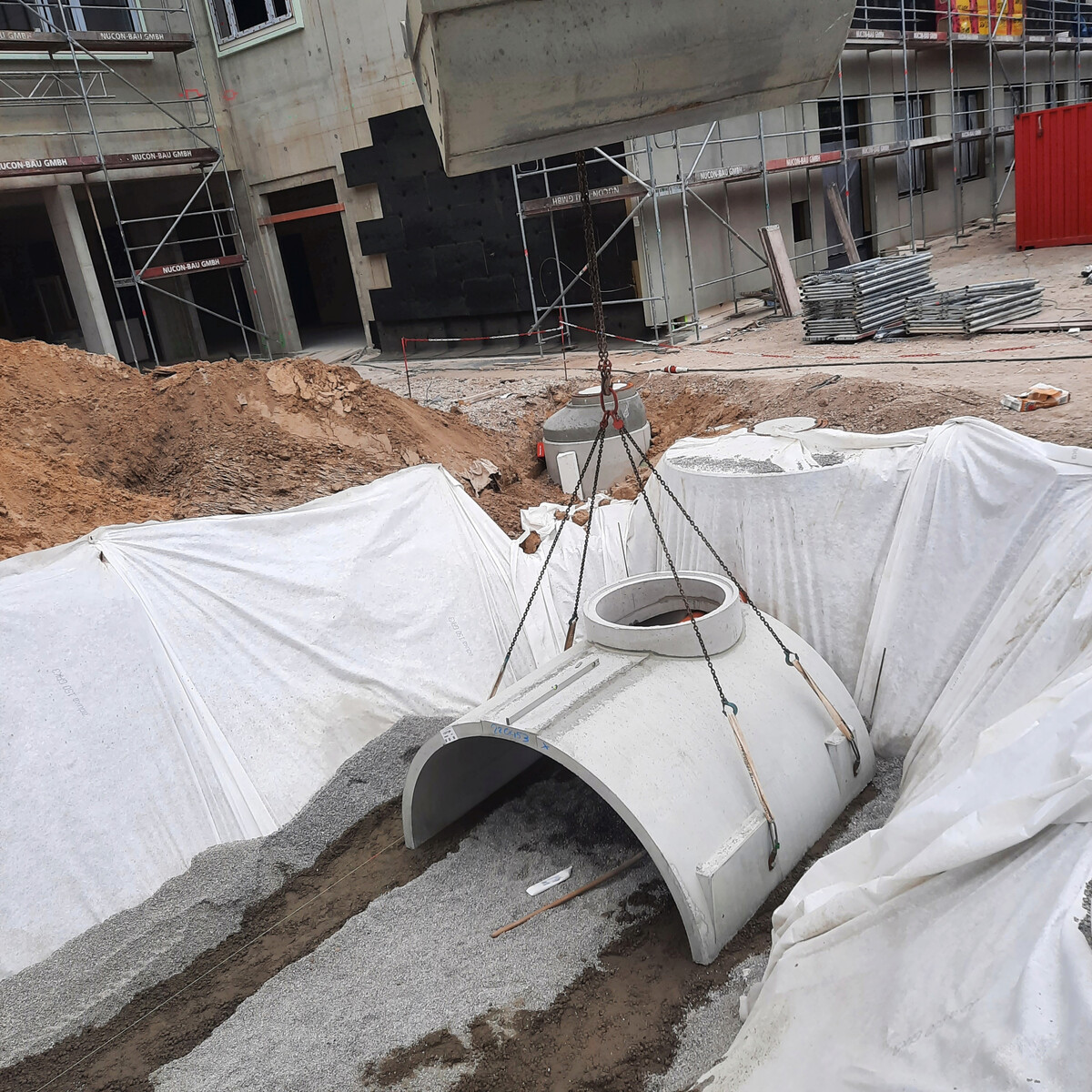 Das gefilterte Regenwasser gelangt dann in die zwei Sickertunnel. Sie bestehen aus jeweils elf Betonelementen und sind damit noch größer dimensioniert als die oben beschriebenen Anlagen. In den Tunnelrigolen lassen sich Niederschlagsmengen von insgesamt mehr als 134 m³ aufnehmen, die über Verbindungsleitungen zwischen den Röhren gleichmäßig verteilt werden. Zusätzliches Retentionsvolumen stellt das in die Baugrube eingebrachte Füllmaterial bereit. Final erfolgt die kontrollierte Versickerung ins Grundwasser.