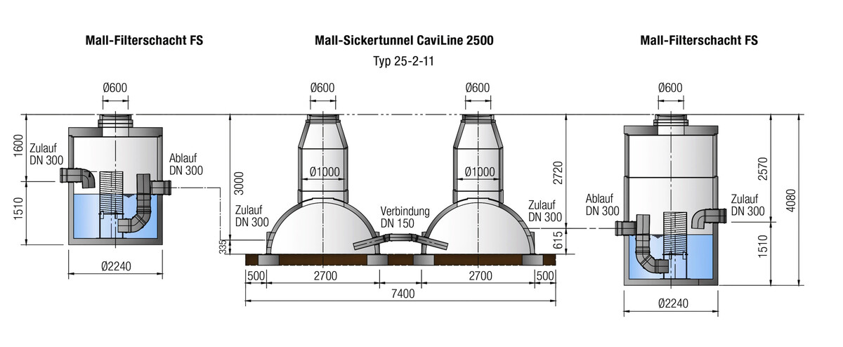 1Da sich die Bodenbeschaffenheit nicht für Sickerschächte eignete, entschied man sich für Tunnelrigolen und vorgeschaltete Filterschächte.