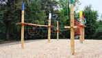 Bei dem neuen Klettergarten von Huck können die einzelnen Parcours- Elemente ganz individuell kombiniert werden. Die Netze und Seile sind aus Herkulesseil, die Stehflächen und Pfosten aus Robinienholz. Letztere können optional mit Farbe zum Streichen der Kopfenden und mit Kerben als Aufstieghilfe geliefert werden. Die Gerätehöhe beträgt circa 4,50 m.
