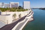Sie liegt zwischen Rhein, Industriearealen und Autobahnbrücke - die neue Rheinpromenade "Elsässerrheinweg". Der neue Uferweg im Basler St. Johann Quartier ist 2,6 km lang und führt von der Dreirosenbrücke über die Landesgrenze ins französische Huningen und weiter über die Dreiländerbrücke nach Weil am Rhein auf deutscher Seite. Die imposanten Kalksteinmauern auf Schweizer Seite sind ein Blickfang. Keine Ecken und Kanten unterbrechen die geschwungene Linienführung. Die unterschiedlich hoch gebauten Mauern sind Teil der terrassierten Topografie, mit der zehn Meter Höhendifferenz - vom Rhein bis zum Areal des Campus Novartis - überwunden werden. Durch die Terrassierung und den Einbezug von Treppen und Rampen ergeben sich verschiedene...