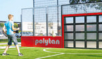 Polytan Yalp Sutu ist eine interaktive Sportwand mit 16 rechteckigen Feldern, die bei Berührung durch den Ball aufleuchten.