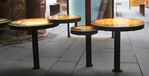 Die Glasteller aus Cortenstahl sind linear in der Kirchenruine aufgereiht und berichten über die wechselvolle Geschichte der St. Christoph-Kirche.