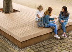 Das Podest mit Baumschatten wurde in vier Einzelteilen gefertigt und geliefert. Der Unterbau besteht aus Cortenstahl mit umlaufend abgekanteten Kanten. Die Sitzauflage mit holzähnlicher Haptik und Optik ist aus dem witterungsbeständigen Naturfaser- Compound Resysta. Das Möbel eignet sich für stark frequentierte Plätze und kann als Sonderanfertigung in allen Größen und Formen angefertigt werden.