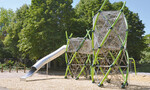 Der "DNA Tower" mit den in sich gedrehten Stahlrohren in Kombination mit dem Kletternetz ist Herzstück des großen Spielplatzes der Freizeitanlage Parkfeld in Wiesbaden.