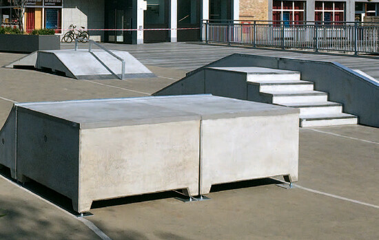 Beim Aufstellen der 38 modularen Betonskateelemente der Firma A+ URBAN DESIGN auf der Brücke über der Autobahn bestand die Schwierigkeit darin, dass nur eine dünne farbige Asphaltschicht über der Abdichtungsmembrane der Brücke vorhanden war, und die Asphaltschicht ein Gefälle in unterschiedliche Richtungen aufwies.