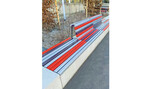 Die Bankauflagen in dreifarbiger Acrylbelattung besitzen teilweise eine Rückenlehne und wurden passgenau für die Betonquader angefertigt, das Farbmuster gab der Architekt vor. Das widerstandsfähige Acryl bietet sich bei starker Beanspruchung an und ermöglicht, nahezu unbegrenzt Farbakzente zu setzen.