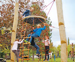 Das Spielgerät besteht aus zwei 4 m hohen Kletterpfählen aus Robinie, die hier verbunden sind mit Vogelnest samt Aufstiegsnetzen.