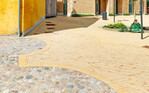 Die Besonderheit: Die Pflasterung wird in das angrenzende Gebäude fortgeführt und schafft so eine Verbindung von außen und innen. Der Platz bezieht sich in Form, Material und Farbe auf die umliegenden Gebäude und verknüpft damit Alt und Neu. Die Architekten entschieden sich für sandgelben Klinker mit Kohlebrand. Die Verlegung erfolgte zum Teil im Fischgrätverband, was dem Platz eine lebhafte Optik und hohe Stabilität verleiht.