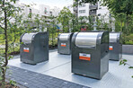 Anstelle einer Batterie von Abfallbehältern für Restabfall und Leichtverpackungen verschwinden die Abfallbehälter in der Erde. Zum Einsatz kommt ein unterirdisches Sammelsystem der Bauer GmbH (Model GTU), das sich über verschiedene Aufnahmesysteme der Entsorgungsfahrzeuge leeren lässt.