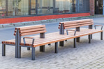 Der Clou ist aber, dass die Bänke dieser Serie nicht nur nach Wunsch mit Rücken- oder Armlehne gefertigt werden, sondern sie sind vielfältig untereinander kombinierbar. Sowohl Reihenbänke als auch Doppelbänke lassen sich durch die modulare Bauweise in rhythmischer Abfolge verbinden. Die Kombinationen der Sitzreihen können Sie ganz einfach mit der Planungshilfe von Nordbahn austüfteln.
