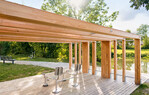 HOLZDECK MIT PERGOLA Prägendes Element des Entwurfes ist das Holzdeck. Es unterbricht den bestehenden Weg und ist barrierefrei bodeneben ausgeführt. Eine filigrane Bedachung beschattet das östlich des Weges liegende Deck samt Fitnessgeräten. Die Lattung des Decks und die Pfosten der Pergola fluchten in einer Linie. Dadurch entsteht ein fließender, fast wellenförmiger Übergang vom Holzdeck zur Pergola. Auf der westlichen Wegeseite geht das Holzdeck in den steinernen Zugang zur Vils über. Die Holzkonstruktion der Pergola besteht aus Brettschichtholz Douglasie (10 x 16 cm), zur Aussteifung dienen Stahlrundrohre je oben und unten (Ø 4 cm, Wandung 2 mm). Mit Pfostenschuhen ist die Pergolenkonstruktion auf das Fundament gedübelt.