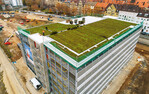 Durch Feinstaubbindung und CO2-Reduzierung trägt das Gründach zukünftig zur Verbesserung der Luftqualität bei. Das eingebaute System MobiRoof besteht aus vorkultivierten Pflanzkassetten, die mit einem Sedum-Mix bepflanzt sind und einen schnellen Aufbau ermöglichen. Eine Drainageschicht muss nicht aufgebracht werden - das gesamte Dach war in drei Tagen begrünt.