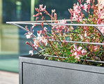 Elegant und robust wirkt er dank des grauen pulverbeschichteten Aluminiums. Er ist in drei Größen erhältlich. Doppelwandige Seitenflächen mit integriertem Dämmmaterial schützen die Pflanzen sicher gegen leichten Frost. Damit alle Pflanzen sicher gegen Staunässe geschützt sind, stattet GARPA den Pflanzkübel mit Lavasteinen, einem Filterflies und einem Rundrohr aus, damit überschüssiges Wasser abfließen kann.
