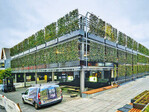 Auch das zentral auf dem Gelände liegende Parkhaus P2 mit fast 300 Stellplätzen wurde umgestaltet und die Fassade des 2002 in Stahlskelettbauweise errichteten Gebäudes begrünt. Die Wahl fiel auf das fassadengebundene Begrünungssystem „Elata“ des schwäbischen Unternehmens HELIX PFLANZENSYSTEME, das auch mit der Realisation des betraut wurde. Auf einem Großteil der 36 m breiten Nordseite so¬wie der halben Westseite des Parkhauses wurden 69 Pflanzkästen mit einer Gesamtlänge von 154 m platziert. Die Kästen sind jeweils bis zu 2,50 m lang und in drei horizontalen Reihen montiert. Über den beigefügten QR-Code erfahren Sie mehr über das Projekt.