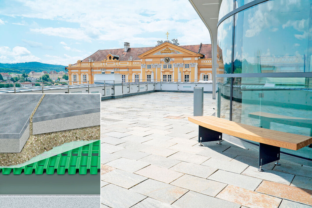 Dabei wurde auf der 350 m² großen Dachterrasse hochwertiger Naturstein verlegt – zusammen mit der Flächendrainage AquaDrain T+ von GUTJAHR. Diese sorgt seit zwölf Jahren für schadensfreie Beläge. Ein spezielles Problem war die bis zu 40 cm dicke Wärmedämmung des Bauwerks. Die lose Verlegung des hochwertigen Belags im Splittbett war deshalb die einzige sinnvolle Lösung. Um den Luserner Gneis dauerhaft vor Schäden zu schützen, brauchte es eine komplett wasserdurchlässige Konstruktion , was AquaDrain T+ ermöglichte.
