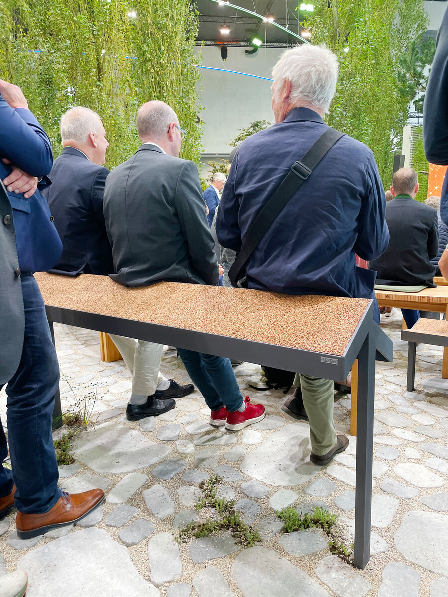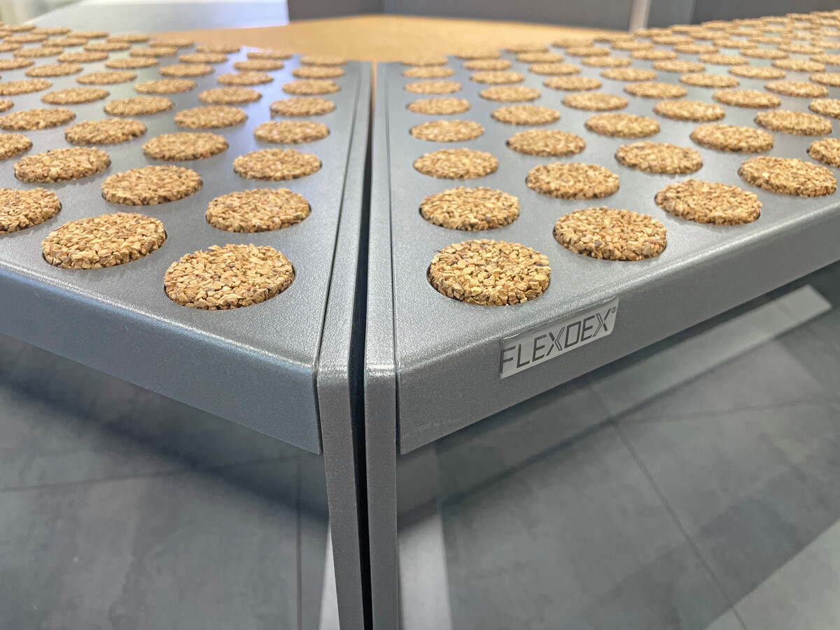 Auf der Suche nach geeigneten Materialien für diese Decks stieß sie auf Kork. „In das Material habe ich mich verliebt. Es kommt aus Europa, ist nachhaltig, und temperaturausgleichend. Es hat alle meine Anforderungen an einen guten Bodenbelag erfüllt“, schwärmt sie. Und um aus Kork auch Polster und Sitzauflagen herstellen zu können, hat sie ein Herstellungsverfahren entwickelt. Bisher kam Kork in Formteilen nur im Innenbereich zum Einsatz. Susanne Mossal-Wagner experimentierte so lange mit Trennmitteln und unterschiedlichen Bindemittelmengen, bis sie Korkformteile herstellen konnte, die licht- und UV-beständig sind. Wie für einen Fallschutzboden bringt sie zunächst eine grobe und darüber eine Schicht mit feiner Körnung auf. „De-ren Elastizität ähnelt der einer Gymnastikmatte und ist auch ideal zum Sitzen“, erklärt Mossal-Wagner. Demnächst bereichern also Stadtmöbel mit Sitzflächen aus Kork öffentliche Räume.