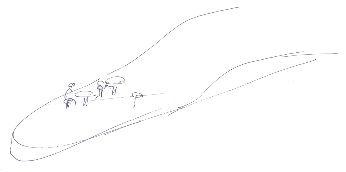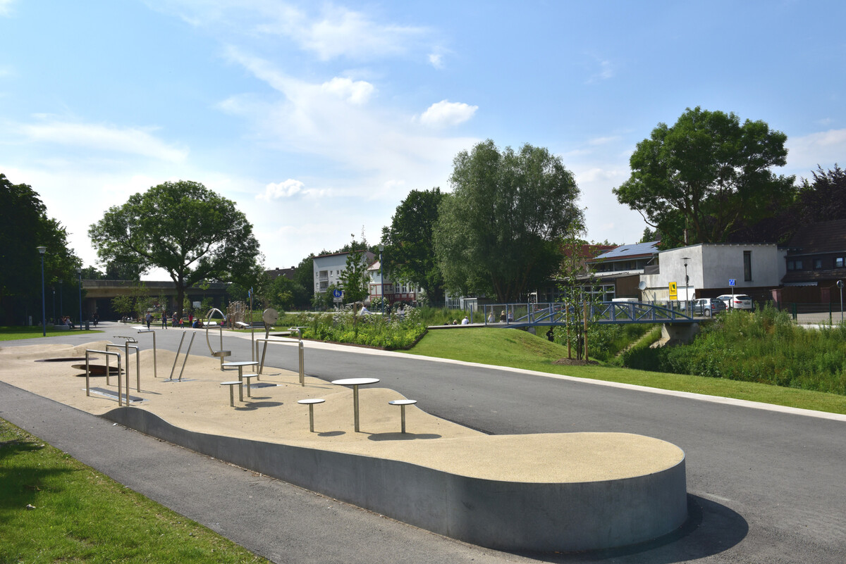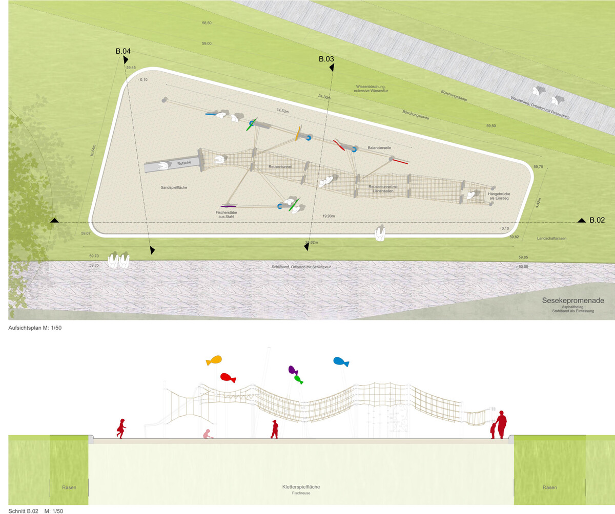 Das Aktivitätsband für mehrere Altersklassen integriert sich in die aufgeweitete Sesekepromenade. Die asphaltierte Weg- und Platzfläche geht direkt über in das Aktivitätsband: Der modellierte Fallschutzbelag wölbt sich bis zu 45 cm nach oben: Er formt kleine Hügel und Wellen und steigt zur einen Seite hin an. Bodentrampoline und Balancierelemente ergänzen den Bereich, ebenso Sportgeräte und Brettspieltische für die Altersgruppe 50+.