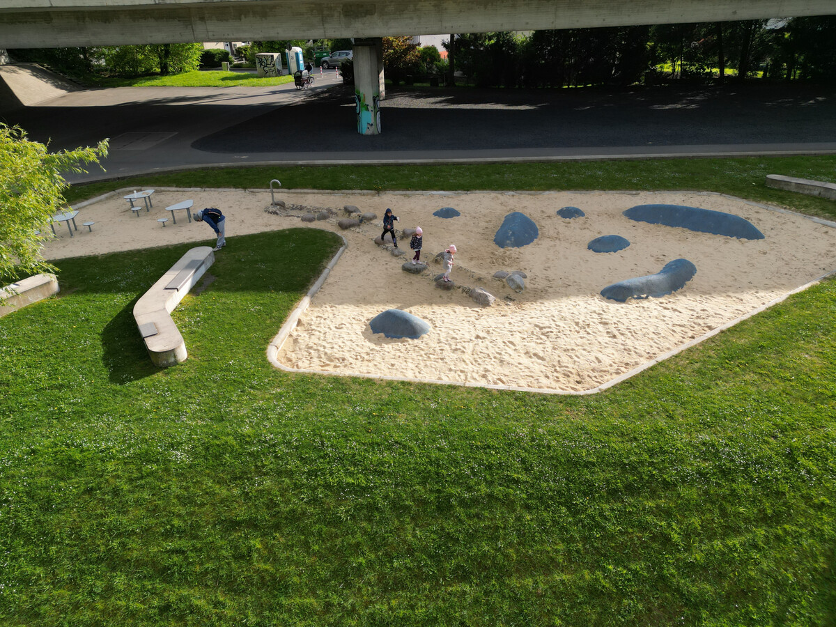 Am westlichen Start der Sesekepromenade fügt sich das Wasserspielfeld ein: Es ist eine modellierte Hügellandschaft, mit Sandfläche samt Sandtisch und einem Wasserlauf, der mit Findlingen eingefasst wurde. Die Spielfläche liegt 10 cm tiefer als die umgebende Rasenfläche und ist mit einer breiten Betonkante umgrenzt, die höhengleich in den Rasen übergeht.