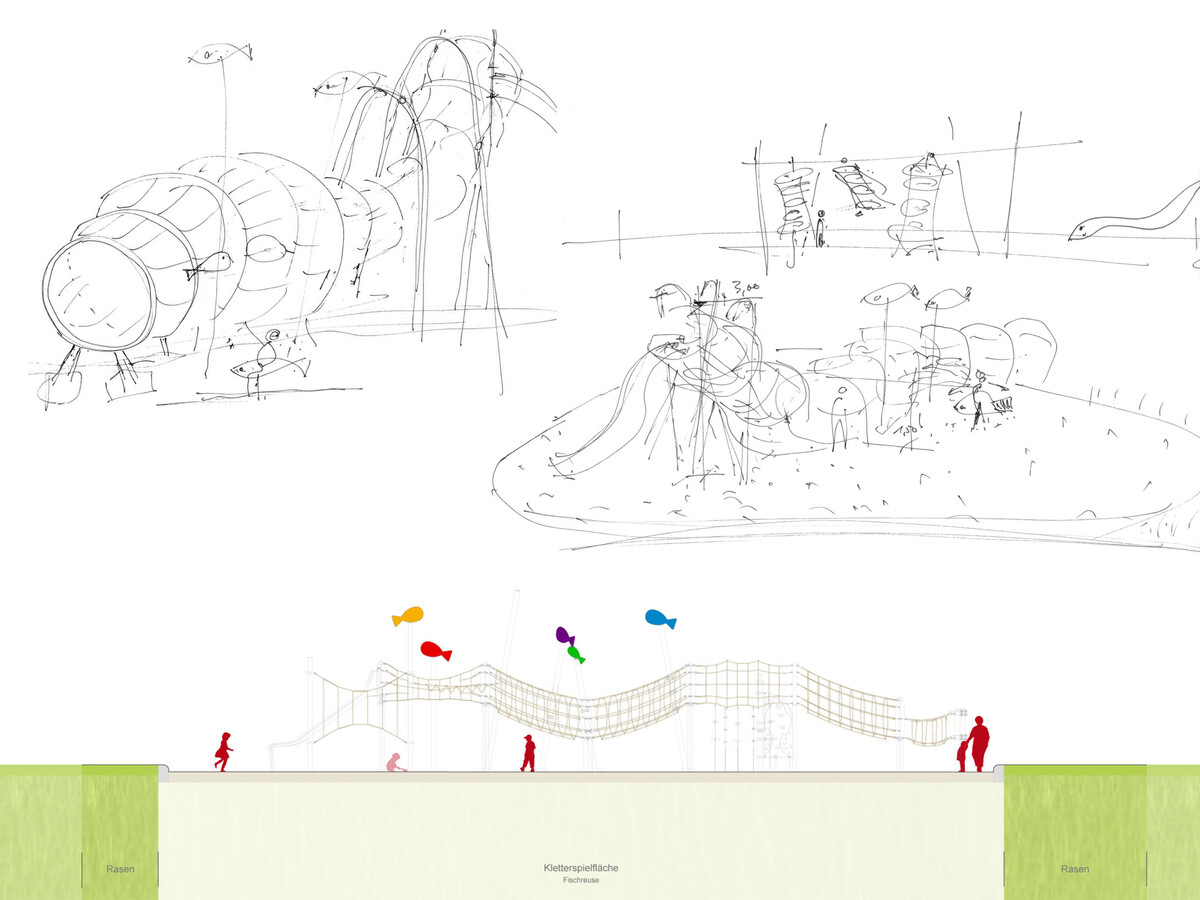 Auch die Kletterspielfläche integriert sich als eigenständiges Element in die umgebende Rasenfläche. Ein Klettergerät, das an eine Fischreuse erinnert und fast 20 m lang ist, dominiert die Sandspielfläche, die ebenfalls mit einer Betonkante gefasst wurde.